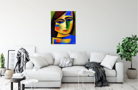 Dit abstracte canvas met de afbeelding van een Indiase vrouw verfraait je woonkamer in de zuiverste traditie van moderne abstracte schilderkunst.