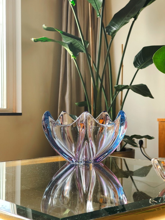 Grote Murano-achtige schaal met organische, golvende vormen in blauw en paars glas uit de jaren 60. Het blauwe glas vangt het licht op een schitterende manier en maakt deze schaal een echte blikvanger op tafel of dressoir.