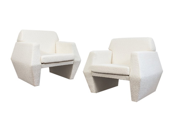 Dit paar geometrische fauteuils weerspiegelt de modernistische stijl van de jaren 70 en sluit aan bij de monumentale en geometrische architectuur van die tijd.