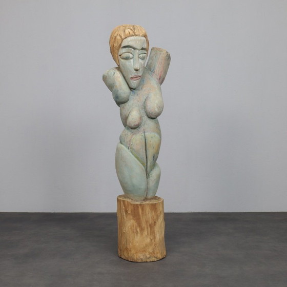 Het beeldhouwwerk toont een gestileerde vrouwelijke figuur, rechtstreeks uit massief hout gesneden en gemonteerd op een cilindrische sokkel. De proporties zijn bewust langgerekt en vereenvoudigd, met zacht afgeronde vormen en een subtiel gekanteld hoofd dat kwetsbaarheid en innerlijke reflectie uitstraalt. Sporen van het handwerk zijn nog zichtbaar op het oppervlak, wat de tactiele kwaliteit van het werk versterkt. Een zachte, door de tijd verkregen patina verrijkt het hout, waardoor gedempte tinten organisch uit de nerf tevoorschijn komen.