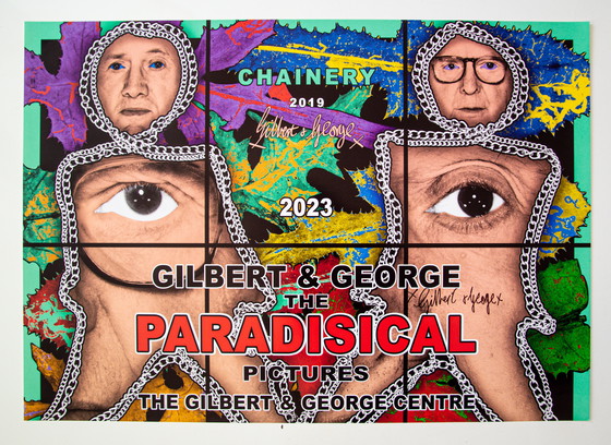 Deze poster 'Chainery' is ontworpen en gesigneerd door Gilbert & George voor de openingstentoonstelling in The Gilbert & George Centre, 2023.