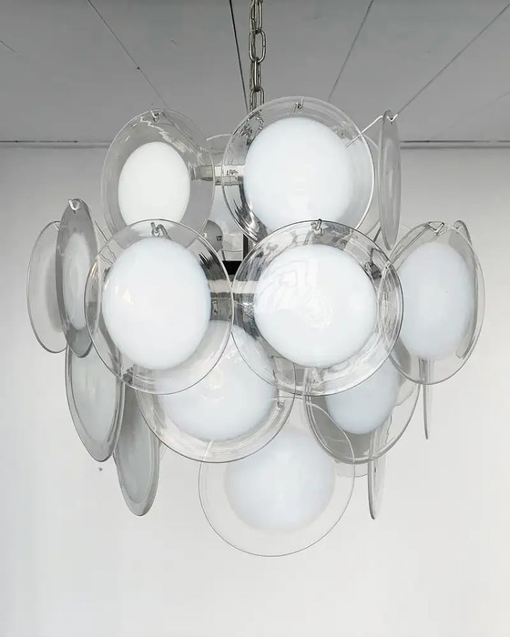 Hier ziet u een zeer zeldzame, aantrekkelijke en zeer goed bewaard gebleven set, bestaande uit twee wandkandelaars en een hangende kroonluchter gemaakt van Murano - glas, door de beroemde Italiaanse ontwerper Gino Vistosi. De drie stukken tonen allen de stijl die Vistosi tot een beroemde en gewaardeerde ontwerper wereldwijd maakte. Zijn stukken zijn zo gewild. Bij deze stukken zijn de schijven gemaakt van wit en helder glas en verbergen ze de metalen structuur van de lampen bijna volledig. Hier door wekken ze de indruk dat ze in de lucht lijken te zweven in plaatst van te hangen. De twee schansen lijk vooral op een hanger voor dames met hun goed uitgebalanceerde geometrische vorm. De kroonluchter telt dertig glazen schijven, terwijl de twee schansen elk zes hebben. Alle glazen schijven zijn origineel en in uitstekende staat bewaard gebleven. Alle drie de lampen zijn geïnspecteerd door een professionele elektricien om ervoor te zorgen dat de verlichting foutloos werkt. De afmetingen in de lijst verwijst naar de kroonluchter. De twee wandkandelaars zijn 45 cm breed en 35 cm hoog en een totale dikte hebben van ongeveer 6/7 cm.