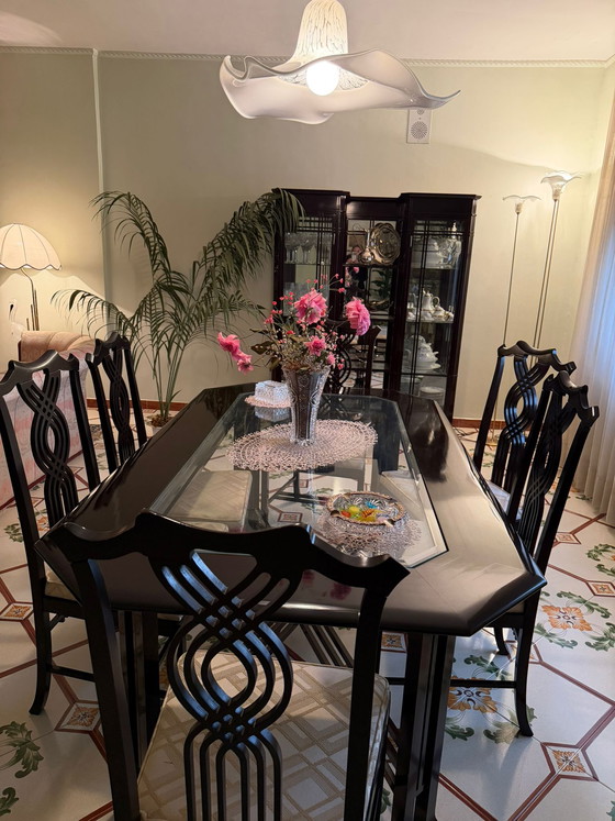 Rechthoekige tafel van hout en glas met bijpassende stoelen met ivoorkleurige, gestructureerde stoffen zittingen. Uitstekende staat. Jaren 70. Giorgetti