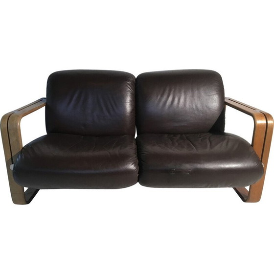 Zeldzame canapé bank 2 plaatsen Giroflex Cuir maron et bois. Ontwerp Albert Stoll (Zwitserse makelij) 1975.