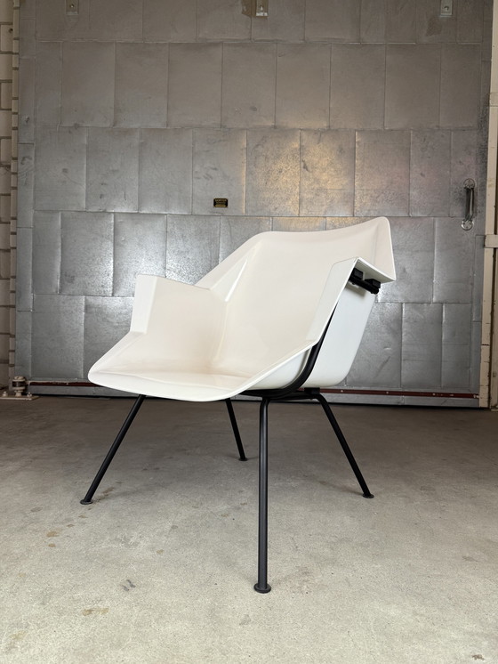 Fauteuil Gispen 416 van Dutch Originals Stafstalen mat zwart gelakt frame Polyester kuip in wit Voorzijde hoogglans, achterzijde gladde afwerking De stoel heeft gebruikssporen/beschadigingen