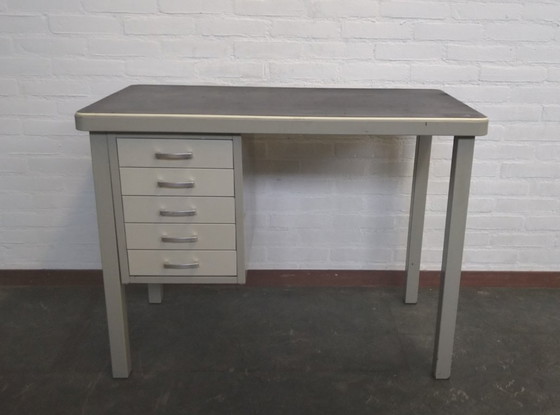 DESIGNER BUREAUTJE : Gispen Jaren '50 AFMETINGEN: 95 x 50 x 71 cm (B x D x H) MATERIAAL: Metalen frame en ladeblok, zwart linoleum blad CONDITIE: goed. Enkele krasjes op de poten en enkele afdrukken in het tafelblad; zie foto’s.