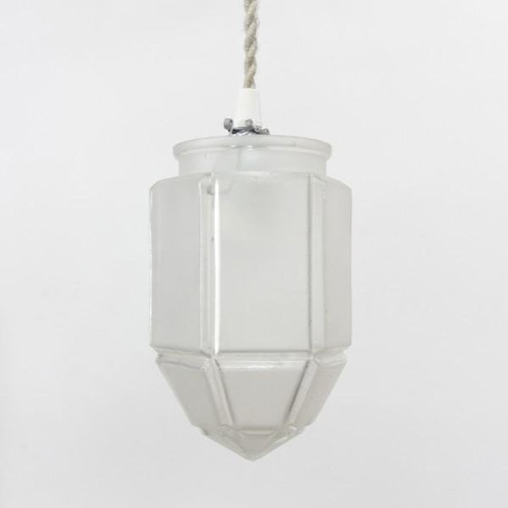 Plafondlamp gemaakt van een gerecyclede Art Deco transparante glazen lampenkap.