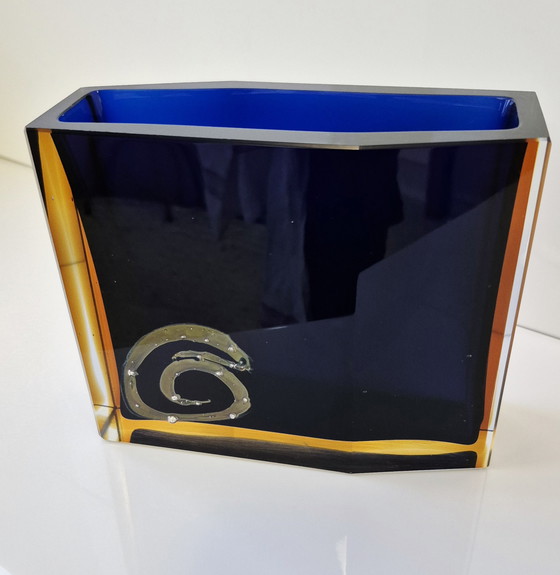 Een nachtelijke hemel met spiraalvormige nevels – dat zou de naam kunnen zijn van deze vaas van blokglas. Pavel Hlava ontwierp hem in de jaren 60 voor Exbor Egermann (1964). De zilverchloride-insluitingen vormen een galactische nevel op het donkerblauwe glas, omlijst door warm oranje glas dat doet denken aan zonnestralen. Een prachtig glazen object met een zeshoekige vorm, gemaakt van zwaar, handgesneden en hoogglanzend kunstglas – een Tsjechisch meesterwerk! Het ontwerp werd in 1967 bekroond met een gouden medaille op de handelsbeurs van Leipzig en behoorde tot de beste producten van het jaar. De afmetingen zijn circa 17 cm breed x 7 cm diep x 14,4 cm hoog. Hij weegt meer dan 2 kg. In zeer goede staat – slechts minimale gebruikssporen zichtbaar op de voet (zie foto's).