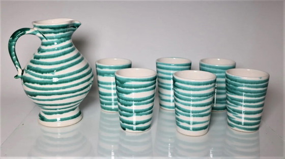 Servies bestaande uit een kan en 6 Gmundner Keramik glazen/kopjes.