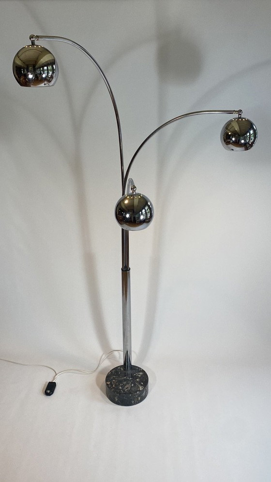 Indrukwekkende vloerlamp van Goffredo Reggiani uit de jaren 70. Deze lamp draagt de naam 'Lily of the Valley' aangezien de lamp doet denken aan het plantje 'Lelietje van Dalen.' Zware marmeren voet, chromen stam met daaruit drie stammen met aan ieder een zware chromen bol ('eyeball'). De lamp verkeert in zeer goede staat.