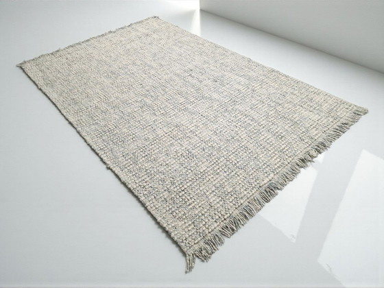 Hoogwaardig 100% wollen vloerkleed van Goossens, model “Paum”, uitgevoerd in een handmatige, grove weefstructuur met een subtiele melange van grijs-, wit- en groentinten. Het kleed is een showroommodel en heeft geen thuisgebruik gehad, waardoor de staat uitzonderlijk fris en gelijkmatig is. Door plaatsing op de showroomvloer zijn aan de onderzijde slechts minimale sporen zichtbaar; dit betreft enkel vlekjes en geen schade.