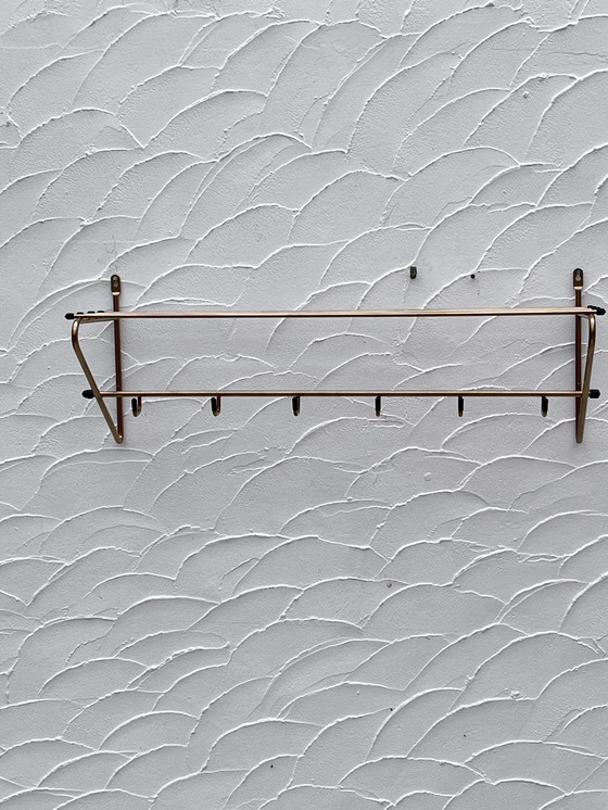 Kapstok en hoed van verguld metaal uit de jaren 60. Zeer goede staat. Afmetingen: 60 x 22 x H 22 cm.
