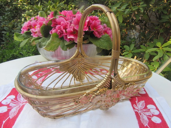 Deze charmante grote goudkleurige metalen (verguld) en glazen schaal/serveerschaal/mand (voor fruit of brood etc.) met handvat is vrij bijzonder met zijn mooie druiven/bladeren design.