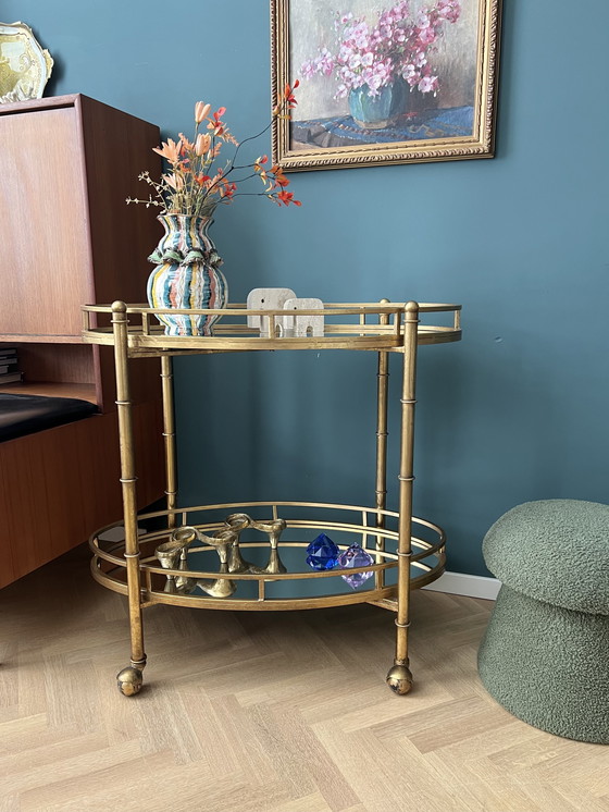 De Normandy Bar Cart biedt de charme van luxe, de matte bladgouden afwerking en het Art Deco-geïnspireerde metaalwerk, bezaaid met decoratieve details. De dienbladen met dubbele bodem hebben een gespiegeld plateau, en elegant afgeronde silhouetten. De perfecte plek voor uw beste dranken en glaswerk. Normandy Bar Cart van Bungalow 5 perfect voor een stijlvolle woonkamer, elegante eetkamer of verfijnd kantoor!