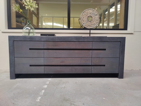 Een handgemaakte massieve grijze dressoir van hout met woonbeton met lades. Deze is ontworpen door onze designers en gemaakt door onze vakmannen in eigen fabriek!