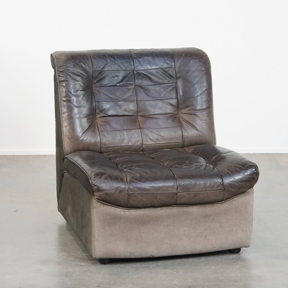 Aangeboden grijze lederen vintage design fauteuil uit de jaren ’70.