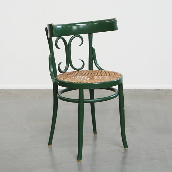 Aangeboden deze leuke groene sierlijke vintage bistro stoel met een gematte rieten zitting.
