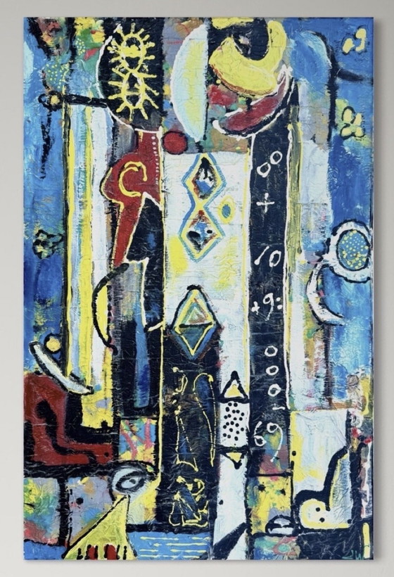 Het doekoppervlak wordt geanimeerd door een samenspel van geometrische en organische vormen, die op hun beurt cirkelvormige motieven, kronkelende lijnen en dynamische hoeken oproepen. De dikke verflagen, met vastberaden gebaren aangebracht, geven het geheel een tactiele textuur en een bijna sculpturale diepte. Deze techniek doet denken aan de expressiviteit van het **abstract expressionisme**, waar de spontaniteit van het gebaar voorrang heeft boven figuratieve weergave.