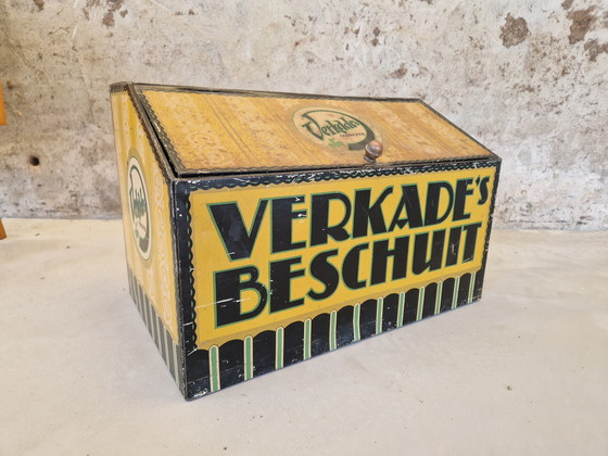 Dit is een groot Nederlands Verkade Beschuit blik uit 1920, met een charmant vintage ontwerp. Het blik is overwegend geel met vette zwarte letters, waardoor het een opvallend decoratief stuk is. Het is gemaakt van metaal en heeft een scharnierend deksel, perfect om op te bergen of tentoon te stellen. Een prachtige aanwinst voor verzamelaars van vintage blikken of Nederlandse memorabilia.