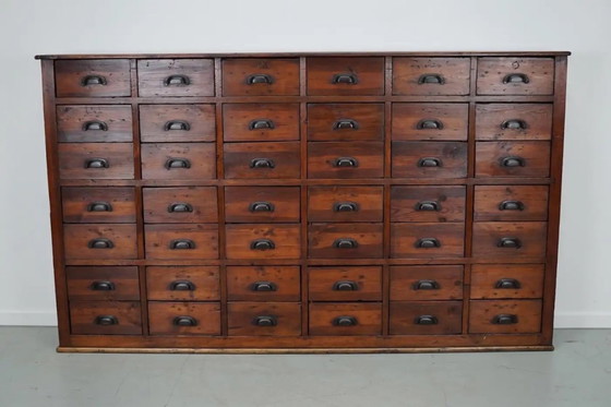 Deze apothekerskast van grenenhout met metalen beslag werd in het begin van de 20e eeuw in Frankrijk vervaardigd en gebruikt in een ijzerhandel. De kast is zeer degelijk gemaakt en verkeert in een goed gerestaureerde staat. De binnenafmetingen van de lades zijn: D x B x H 19 x 26,5 x 12,5 cm. De meeste lades zijn voorzien van vakverdelers.