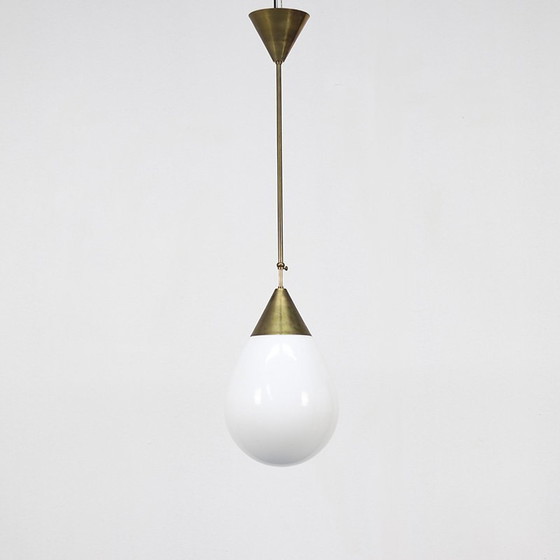 Tamelijk bijzondere hanglamp in Art-Deco stijl doch vervaardigd in de jaren 80. De lamp heeft een prachtig messing armatuur wat in lengte te verstellen is. De lamp heeft een opaline glazen kap in druppelvorm. De lamp is voorzien van nieuwe bedrading en klaar voor gebruik. Uitzonderlijk groot formaat. 150cm max hoogte (is dus in te korten), 28cm diameter kap.