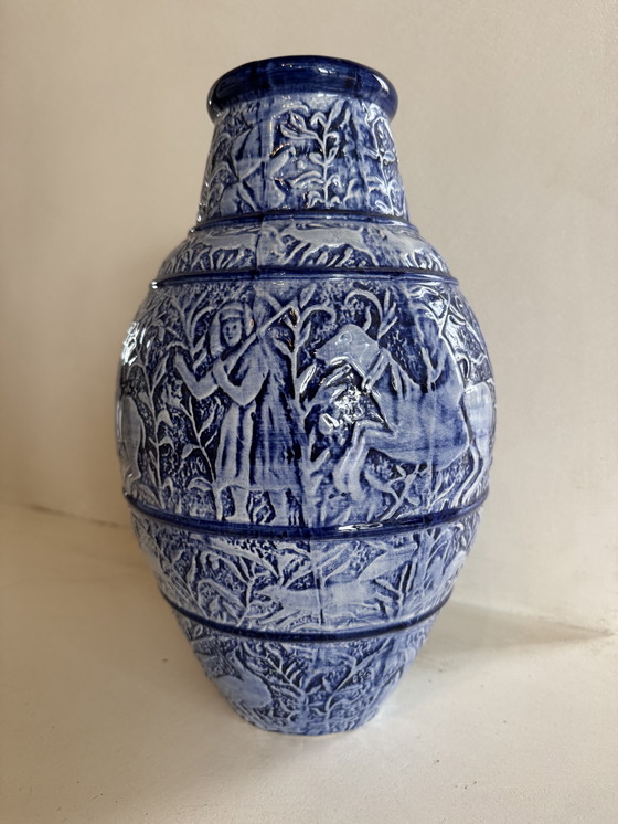Een grote blauwe vaas met een lichaam gedecoreerd met paarden, herten en ruiters, in de stijl van Westerwald zoutsteengoed uit de jaren 50 en 60; algehele zeer goede staat.
