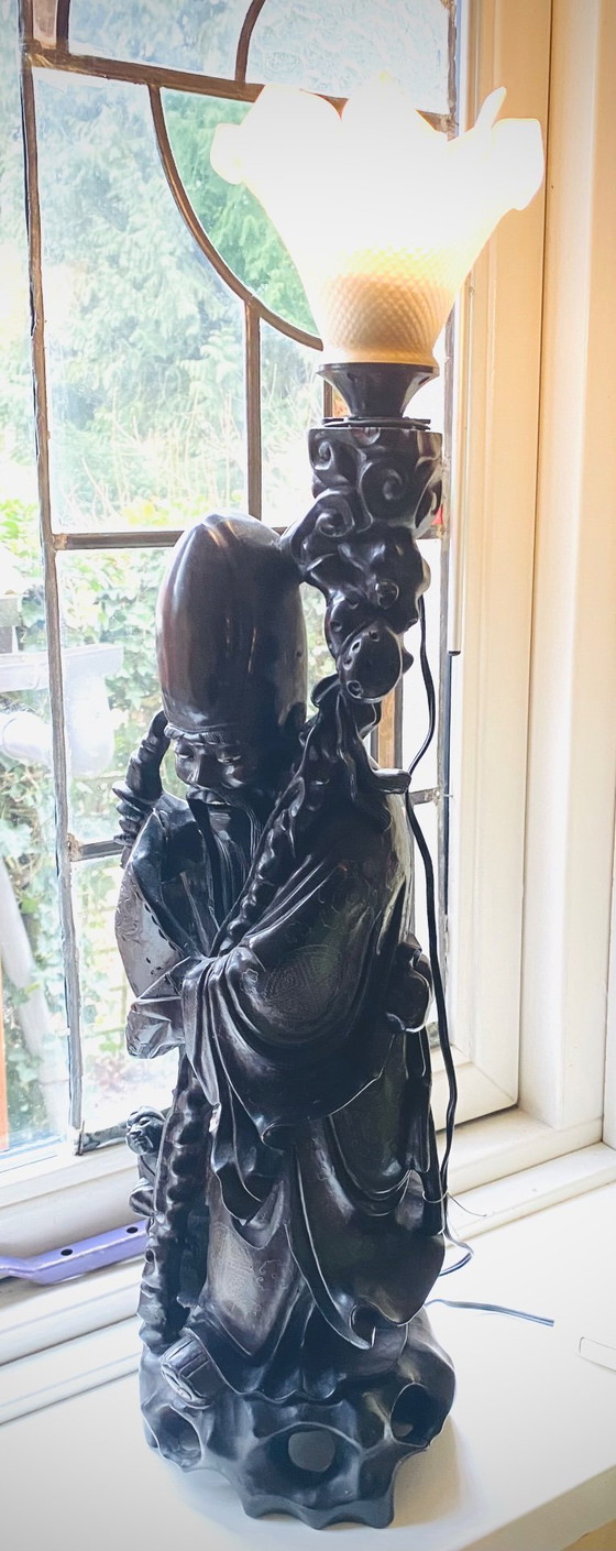 Een grote oude hoge hardhouten hand gesneden Chinese Tafellamp.
