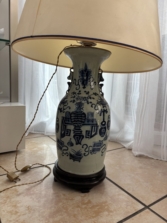 Grote vaas getransformeerd tot lamp (kan weer vaas worden) Chinees porselein met blauwe decoratie