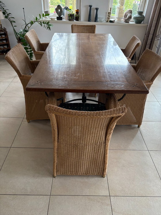 Grote eettafel met zes bijpassende stoelen, perfect voor gezellige diners. Het tafelblad is gemaakt van stevig hout en rust op een elegant metalen onderstel met sierlijke details. De stoelen zijn vervaardigd uit duurzaam riet en bieden comfortabele zitplaatsen. Deze set voegt een rustieke charme toe aan elke eetkamer.