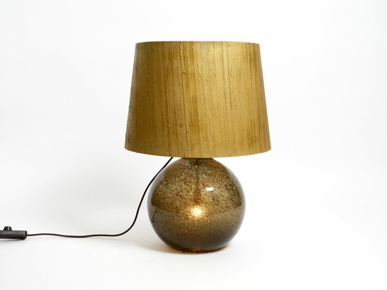 Glazen voet is gemaakt van bruin rookglas met luchtbellen. Grote lampenkap gemaakt van gouden dupion zijde. Dupionzijde heeft een onregelmatige structuur en een glanzend oppervlak, vaak goudkleurig.