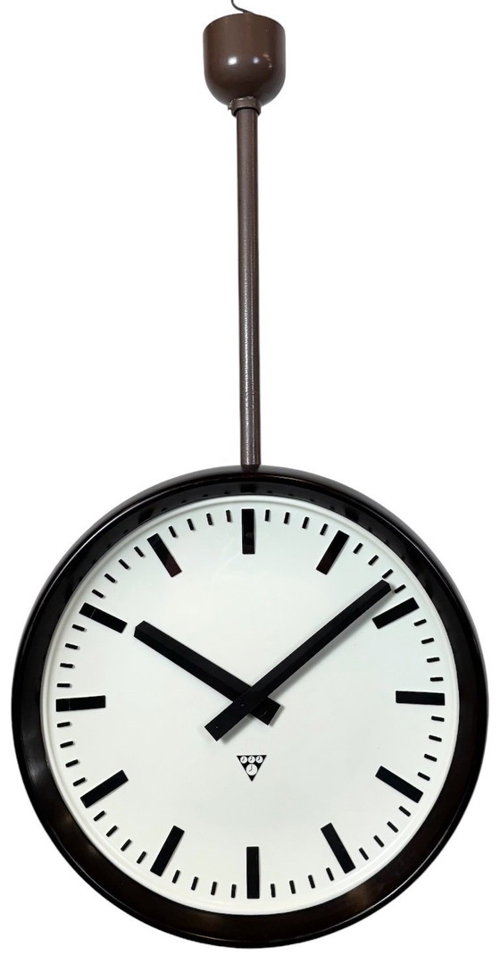 Grote industriële bakelieten dubbelzijdige fabrieksklok van Pragotron, jaren 50