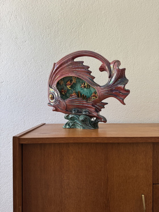 Prachtige grote vislamp uit de jaren 50 en 60 in keramiek van Vallauris of Monaco, iriserend roze kleurverloop; zeer goede algemene staat aan de buitenkant, een paar kleine deukjes in de binnenversiering; origineel elektrisch systeem in werkende staat.