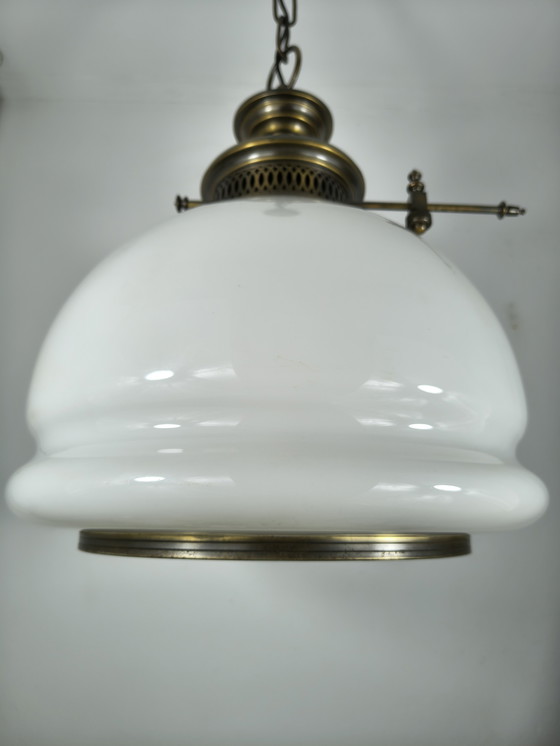 Grote klassieke Vintage hanglamp – 3-lichts opaalglas, open onderkant, patina
