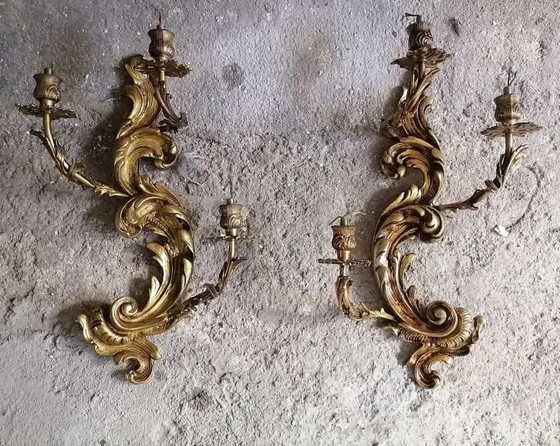 Grote, luxe wandlampen in barokstijl, een paar, elk met 3 lampen! Brons. Italiaanse jaren 40, vintage. Uitstekende staat, werkend. Lamphouders zijn bij de prijs inbegrepen. Afmetingen: H 50, B 24, Uitval 22. Prijs per paar. Veilig verpakt!