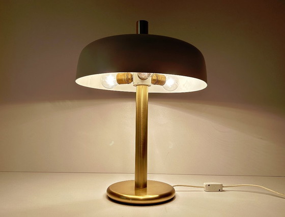 Grote Vintage Mid Century bureaulamp, messing structuur en grote witte paddestoelkap met bijpassende kruisbloem