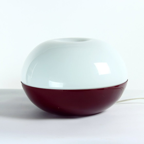 Prachtige vintage tafellamp in een interessante vorm en kleur. De lamp bestaat uit twee delen, allemaal van opaline glas. Het onderste deel is gemaakt van donker bordeaux (of donker paars) glas, het bovenste deel is gemaakt van wit glas. De lamp werkt met één standaard E27 lamp. Europese stekker. Het glas is in uitstekende staat zonder chips of beschadigingen. De vorm van de lamp is een interessante ovaal die er zelfs zonder deksel prachtig uitziet. En als het deksel omhoog staat, geeft het een verbazingwekkend zacht licht. De bovenkant is heel elegant terwijl de onderkant schittert als een juweel in het donker. Er zit een lichte gele stip in de bovenkant van de lamp, zichtbaar op foto's. Dit geeft de lamp een speciaal effect. Dit geeft de lamp een speciaal effect. Prachtig item. Nagekeken door een professional, klaar voor gebruik.