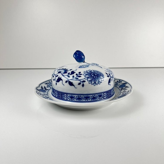 Grote ronde botervloot Hutschenreuther blauw uien porselein Duitsland vintage zeldzaam
