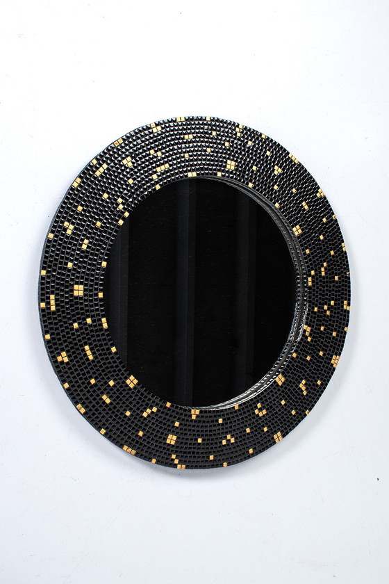 Grote ronde spiegel met mozaïek uit de jaren 50. De spiegel heeft een grote rand met prachtig mozaïek tegeltjes in zwart en goud.Kleine restauratie maar verder in een goede vintage staat.
