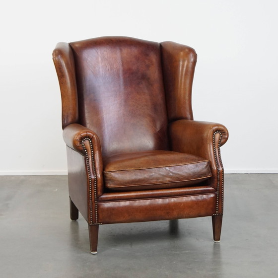 Aangeboden deze grote, royale schapenleren oorfauteuil met warme kleuren en een prachtig patina.