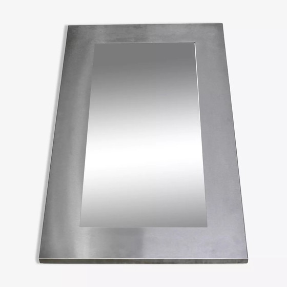 Grote stalen spiegel uit de jaren 70. Kleine vlekjes op het roestvrij staal. Zie foto's. Gestroomlijnde vorm. Hangt in 2 richtingen. Spiegel uit het ruimtetijdperk.