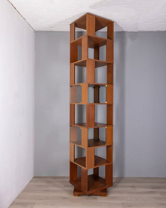 Grote houten draaibare boekenkast voor een centrale plek, met glazen deuren en vergulde messing handgrepen. De bovenste plank heeft een punt die aan het plafond kan worden bevestigd om de kast te stabiliseren. Italiaans design, jaren 60.