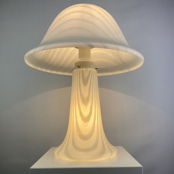 Prachtig Duits ontwerp van Peill en Putzler, geproduceerd rond 1970 - 1980. Deze lamp is gemaakt van twee mondgeblazen stukken kristalglas met een gestreepte zebraprint en heeft de vorm van een typische Mid Century paddenstoel. De lamp wordt direct op het oppervlak geplaatst en geeft heel fijn licht. De lamp kan op drie verschillende manieren worden ingeschakeld, alleen de voet, alleen de kap of beide tegelijk. AFMETINGEN Hoogte: 54cm Diameter: 42cm Snoerlengte (met EU stekker): 140cm