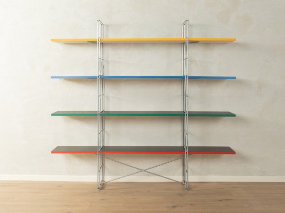 Zeldzame GUIDE-plank van Niels Gammelgaard voor IKEA uit de jaren 80. Gepoedercoat metalen frame in matgrijs met vier planken van gefineerd spaanplaat in zwart met gekleurde randen.