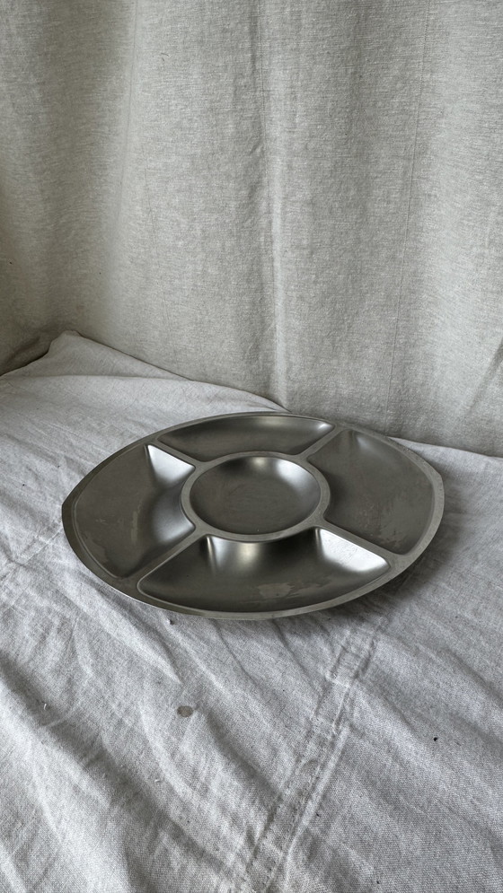 Deze geborstelde rvs met glanzende randjes schaal is gemaakt door Guy Degrenne. De vorm is erg speciaal, ovaal met puntjes op de uiteindes. Het lijkt wel een soort oogje. Deze schaal maakt elke tafel gelijk feestelijk. De schaal kan gebruikt worden voor hapjes met bijvoorbeeld in het midden een sausje maar kan ook als dessert plateaus of voor sieraden te presenteren.