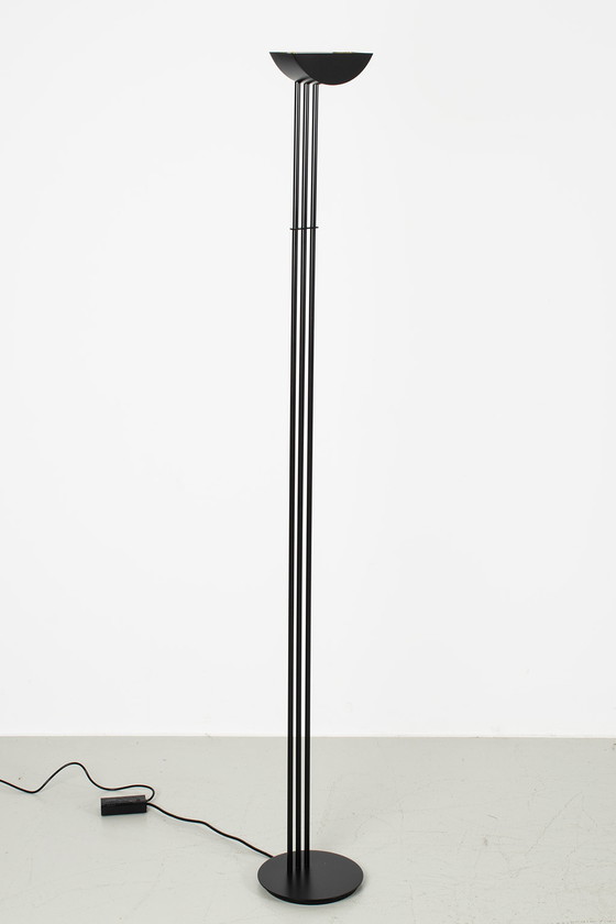 Elegante halogeen vloerlamp. Deze uplight heeft een handige vloerdimmer.Hoogwaardige kwaliteit zwart gelakt messing.De lamp is nog nooit eerder gebruikt (New Old Stock) en is dus nog in een zeer goede vintage staat.