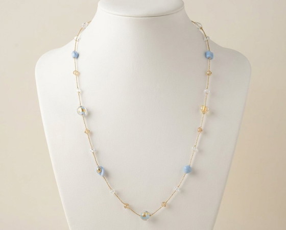 De combinatie van het delicate blauw van het glas en puur goud zorgt voor een stralend en verfijnd effect, perfect voor zowel elegante gelegenheden als om alledaagse outfits te verfraaien.