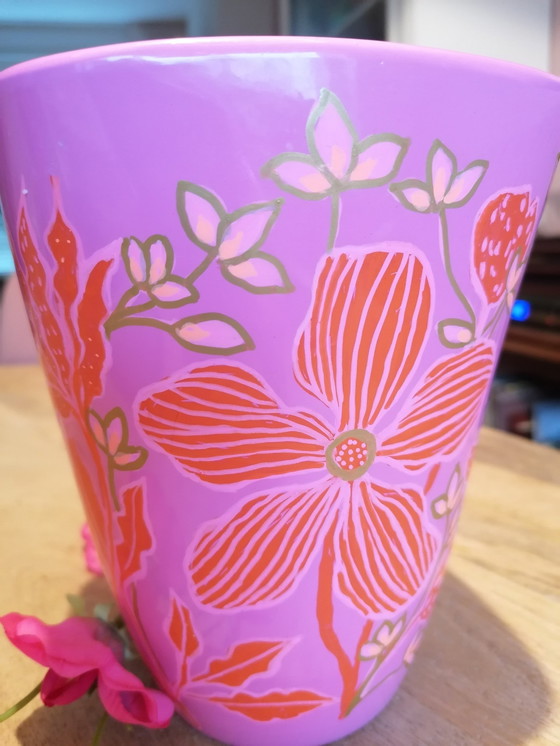 Handbeschilderde vaas, beschilderd met sierlijke fantasie bloemen. Oranje op roze, een gedurfde maar geweldige combinatie. De blaadjes zijn geaccentueerd met gouden lijntjes. De vaas is 17h*13br, heeft een goede beschermlaag en is waterbestendig. De vaas kan verzonden worden, wordt zeer goed verpakt!