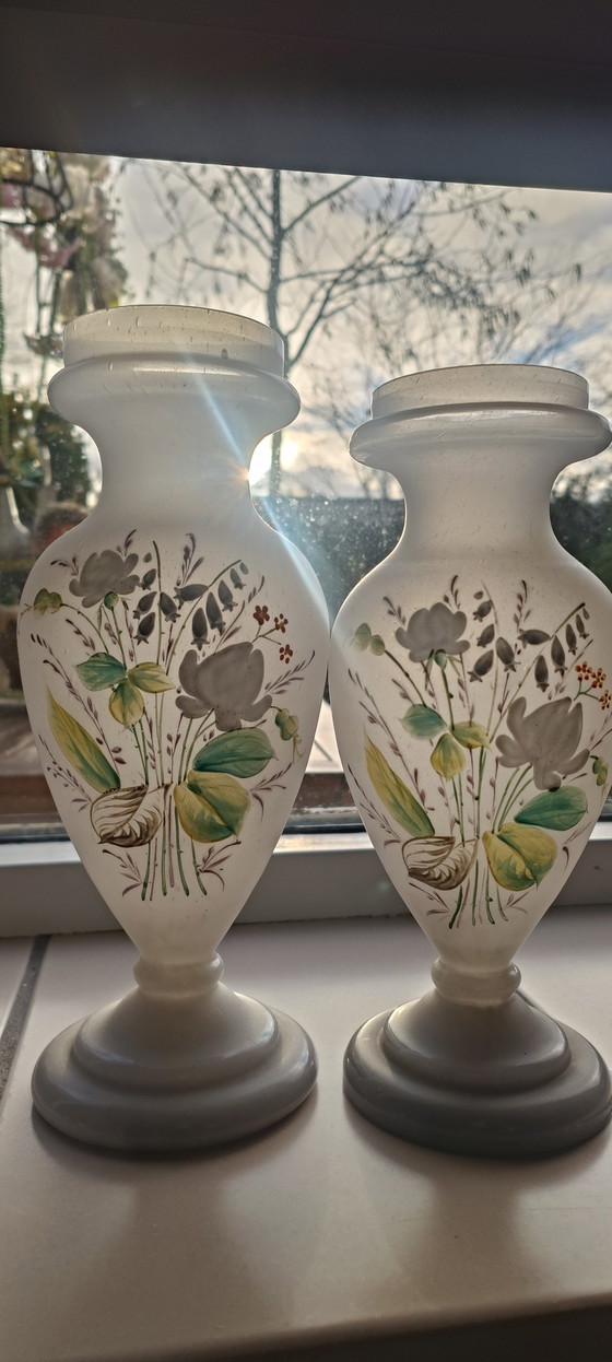 Prachtige handgeblazen opaline vazen, vermoedelijk Frans, eind 19e / begin 20e eeuw. Deze set van 2 identieke vazen is handbeschilderd met elegante bloemmotieven en heeft een karakteristiek pontil-spoor aan de onderzijde, zichtbaar bij het licht.