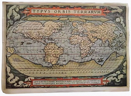 Deze prachtige kaart, getiteld "Nova Totius Terrarum Orbis Tabula", toont de wereld in twee hoofdhemisferen, aangevuld met twee kleinere poolkaarten en vier schitterende decoratieve vignetten in de hoeken die de elementen, ontdekkingsreizen en mythologie symboliseren (waaronder veldslagen, schepen, exotische dieren en figuren). De geografie weerspiegelt de kennis van die tijd: Californië als eiland, een onvolledig Australië en Nieuw-Zeeland, en het legendarische Terra Australis.