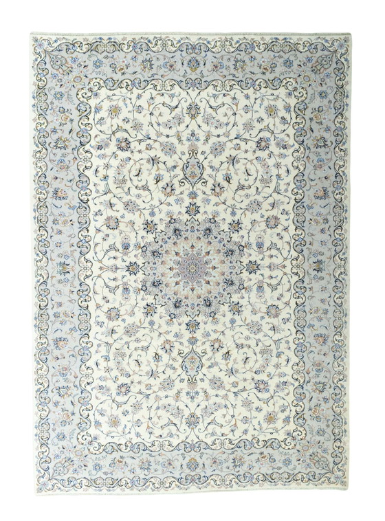 Dit elegante handgeknoopte Kashan oosterse tapijt meet maar liefst 350 x 245 cm en maakt indruk met zijn delicate bloemenpatroon op een crèmekleurige achtergrond. In het midden is een fijn medaillon omringd door symmetrisch gerangschikte ranken, bloemen en arabesken - een klassiek kenmerk van de Kashan-traditie.